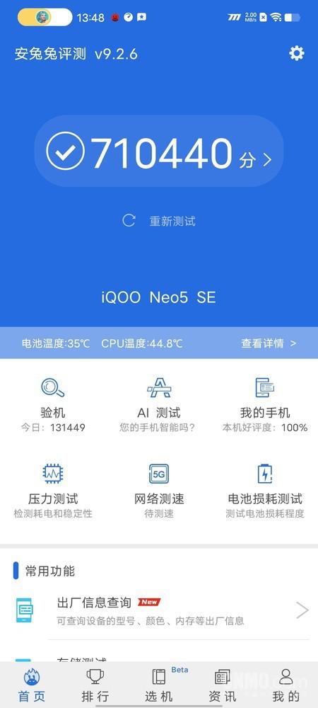 經(jīng)過跑分實(shí)測,iQOO Neo5 SE在安兔兔中獲得了71萬分的成績,表現(xiàn)符合我們的預(yù)期。而且得益于UFS3.1芯片的加入,iQOO Neo5 SE在讀寫速度上表現(xiàn)得也很出色。