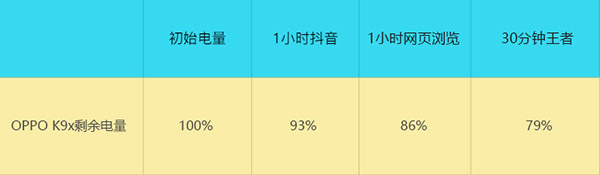 為了實測手機(jī)的續(xù)航表現(xiàn),我們把手機(jī)充電至100%,然后經(jīng)過1小時抖音,1小時網(wǎng)頁瀏覽,30分鐘王者,最后OPPO K9x仍擁有79%電量,可見其剩下的容量還能保持長久的使用體驗。