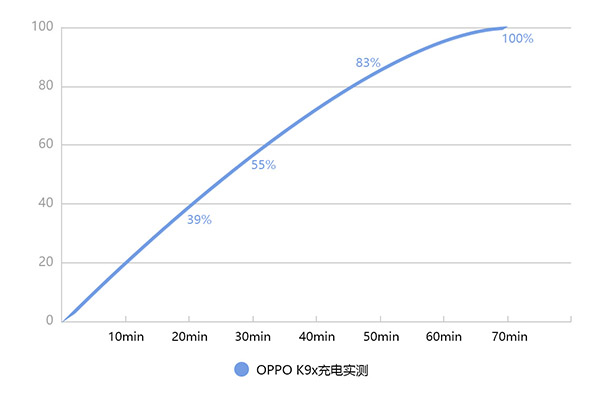 我們對手機(jī)也進(jìn)行了充電實測,從上面的表格可以看到,OPPO K9x在前30分鐘充電速度非常快,30分鐘時的電量就達(dá)到了55%,到了后半段的涓流充電速度也很快,有這樣快的充電速度,即使長時間游戲后電量告急,吃個飯的時間OPPO K9x又能充滿了,大大緩解了電量焦慮。