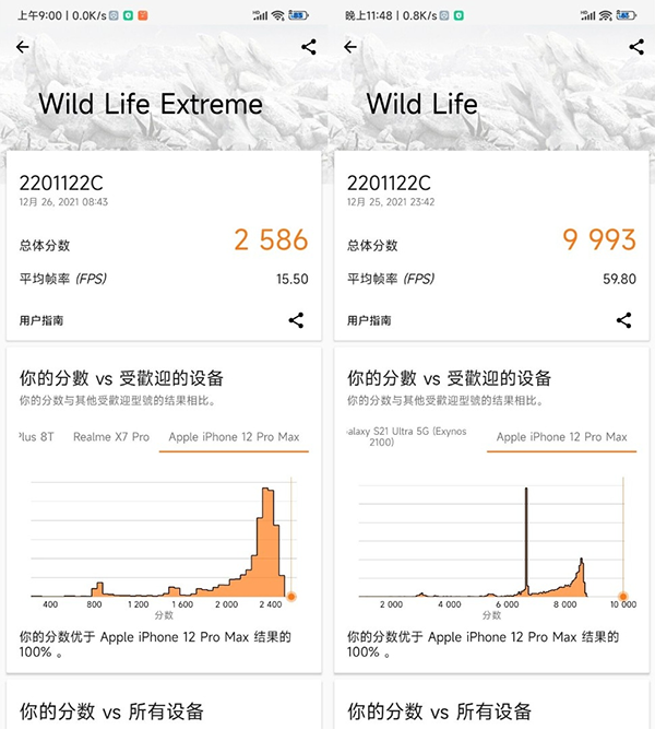 GPU方面,我們使用3DMark進(jìn)行測(cè)試。在Wild Life測(cè)試中,小米12 Pro跑出了9993分的好成績(jī),而在更加苛刻的Wild Life Exterme測(cè)試中,小米12 Pro跑出了2586分的好成績(jī),性能表現(xiàn)與蘋果iPhone 12 Pro Max不分伯仲。