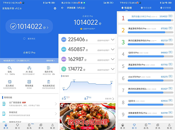 在性能測(cè)試中,小米12 Pro第一次安兔兔跑分測(cè)試就得到了101萬(wàn)分的好成績(jī),綜合成績(jī)可以輕松達(dá)到100萬(wàn)分以上。作為對(duì)比,小米MIX 4(驍龍888 Plus)的跑分是80萬(wàn)分左右,小米10 Pro(驍龍865)的跑分是67萬(wàn)分左右,小米12 Pro的性能在目前的安兔兔榜單中位列第一,相比驍龍888和驍龍888 Plus有著更加優(yōu)異的表現(xiàn)。