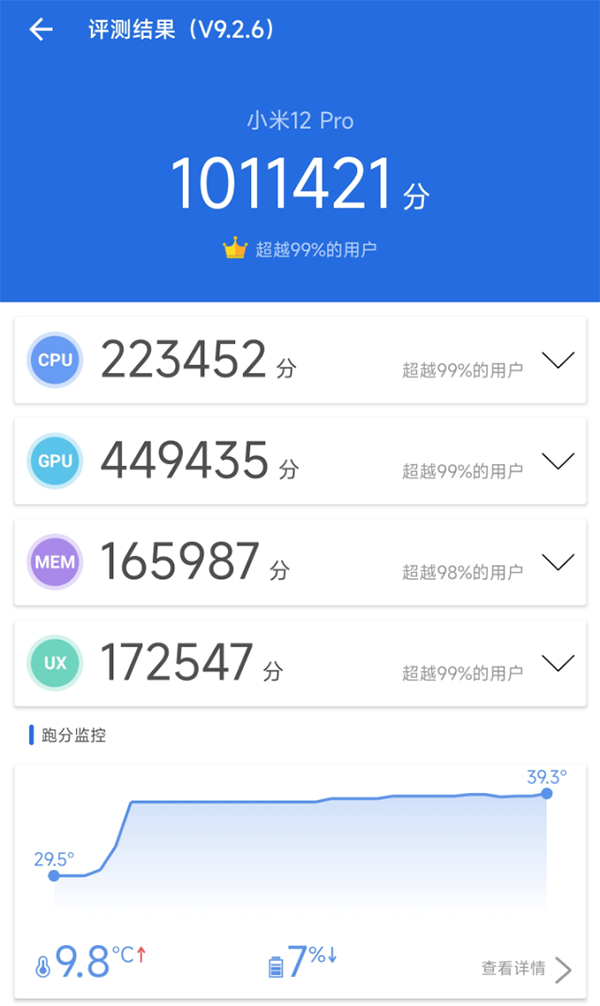 初始電量80%以上和開啟性能模式下,經(jīng)過三次安兔兔(版本9.2.6)的測(cè)試后,小米12 Pro最高分為101萬分,最低為98萬分,最高分的測(cè)試過程中機(jī)身溫度上升了9.8度,達(dá)到了39.3度。并且,我們五次的跑分測(cè)試中,出現(xiàn)兩次安兔兔長(zhǎng)時(shí)間“卡死”,最終只能手動(dòng)關(guān)閉程序后臺(tái)重新開始,也許是軟件、硬件和系統(tǒng)的不完全適配所導(dǎo)致的。