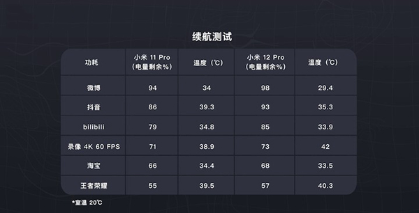 在5G狀態(tài)下,我們與小米11Pro進行了對比測試。小米12 Pro表現(xiàn)稍好一些,但差距不大。錄像測試耗電較多,溫度也飆升至42℃,有待進一步優(yōu)化。
