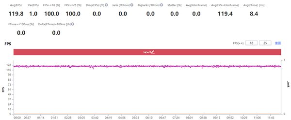 iQOO Neo5 SE支持《王者榮耀》原生120幀超高幀率模式,可充分發(fā)揮144Hz競速屏帶來的高刷流暢優(yōu)勢。同樣的, 經(jīng)過PerfDog性能測試顯示,iQOO Neo5 SE上能長時間保持在120幀下運行,在一些人數(shù)多特效豐富的大場景下,幀數(shù)會掉到100幀附近,但整個游戲過程依然保持流暢,游戲記錄的平均幀數(shù)達到了119.8幀。