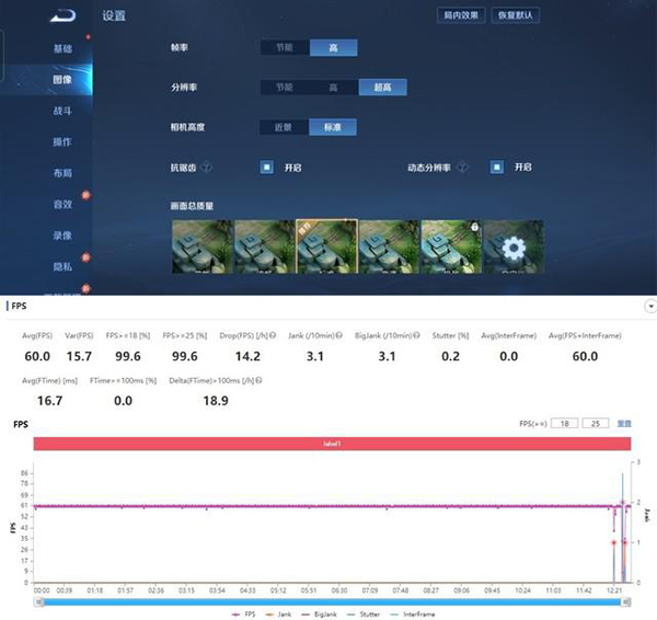 為保證手機性能的不斷輸出,我們先將手機調至性能模式,再將游戲局內畫面設置選項拉滿(超高幀率、超高分辨率、抗鋸齒、動態(tài)分辨率、高清畫面質量),進行15分鐘的游戲測試觀察其幀率表現(xiàn)。