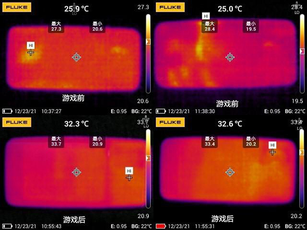 均衡的手機性能,不止體現(xiàn)在幀率、跑分,散熱性能更是重點。為了散熱更加徹底OPPO K9x采用了迅冷智控散熱系統(tǒng),總散熱面積達13850mm,能將CPU散發(fā)的熱量均能傳導到機身每一處。此外,OPPO K9x在機身內部安置了5顆溫度傳感器,對機身內部的熱量實時監(jiān)測,針對發(fā)熱量較大的位置重點降溫。為了更好地驗證其散熱能力,我們分別對游戲前后采取了四次溫度樣本一起來看看。
