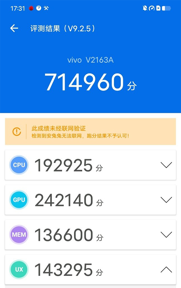 筆者使用安兔兔(V9.2.5版本)進(jìn)行跑分測試,獲得了總分714960分的成績。還記得天璣1200剛推出的時(shí)候,跑分成績大多在70萬左右,而vivo S12 Pro可以達(dá)到接近72萬分的成績,無不說明vivo的工程師們已經(jīng)吃透了這顆性能,并在這款產(chǎn)品上壓榨出更強(qiáng)大的性能。