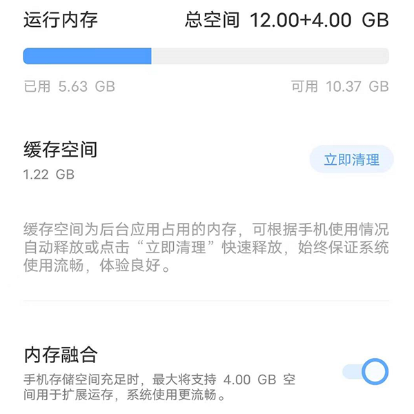 對同價位段的手機來說,流暢運行微信、微博、抖音等常用軟件完全沒有壓力,可當后臺的應用數量增多,或者開啟一個動輒幾個G的手游時,手機的運行速度便會被拖慢。因此,iQOO Neo5S在提升硬件配置的同時,還采用了內存融合2.0技術,可以將4GB的存儲空間,調度給運存使用,如果你手中的是12GB運存版本,便可以獲得12GB+4GB的運存體驗,即便后臺掛著多個應用,也不容易出現殺后臺的問題。