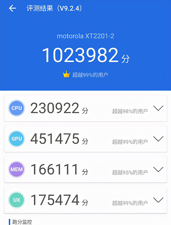 從跑分上我們同樣可以看到摩托羅拉edge X30的強悍:經(jīng)過安兔兔實測,摩托羅拉edge X30跑分達到102萬分,成功突破百萬。這不僅僅依靠強大的全新一代驍龍8移動平臺,同樣離不開Turbo LPDDR5以及Turbo UFS 3.1等強悍硬件的加持。同時為了提升用戶體驗,摩托羅拉edge X30還在軟件層面加入了內(nèi)存拓展、碎片整理、閃電啟動等軟件優(yōu)化,確保摩托羅拉edge X30的性能可以穩(wěn)定釋放。