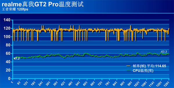 得益于良好的散熱設(shè)計(jì),在《王者榮耀》120幀模式下,realme真我GT2 Pro的溫度控制也是非常出色,在室溫20度的環(huán)境下,測(cè)試20分鐘,最高溫度63.3度,游戲并沒(méi)有因?yàn)闇囟忍嵘霈F(xiàn)嚴(yán)重的掉幀現(xiàn)象。