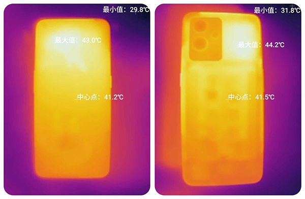 機(jī)身溫度方面,背面最高溫更是達(dá)到了44°C上下,特別是貼近手掌的上中框區(qū)域,你能夠明顯的感受到“炙熱”,畢竟——