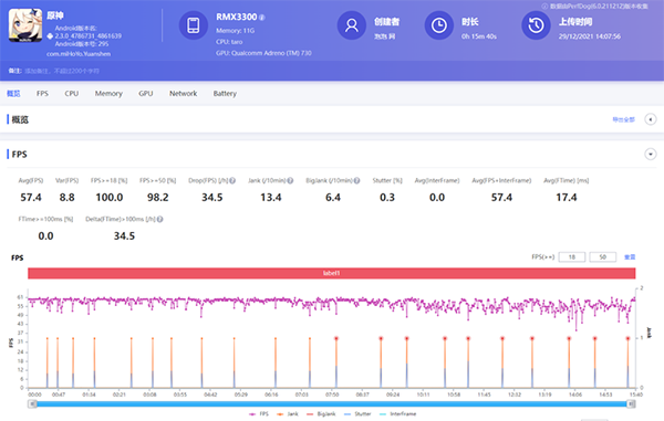 《原神》對(duì)手機(jī)性能要求非常高,非??简?yàn)手機(jī)散熱能力以及調(diào)度調(diào)教。我們開(kāi)啟手機(jī)GT模式后開(kāi)始測(cè)試,游戲畫(huà)面為極高畫(huà)質(zhì)60+幀模式。PerfDog軟件記錄到的平均幀數(shù)為57.4幀,雖然幀數(shù)波動(dòng)幅度較大一點(diǎn),但這樣的幀數(shù)表現(xiàn)已經(jīng)十分出色,98.2%的時(shí)間里幀數(shù)都不低于50幀,游戲過(guò)程畫(huà)面流暢度保持得很好,游戲體驗(yàn)出色。