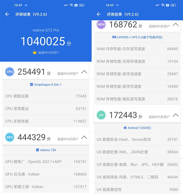 我們使用最新版的安兔兔評測對真我GT2 Pro進行了綜合性能測試。可以看到,在開啟了realme標志性的“GT模式”后,這臺新旗艦輕松達到了超過104萬分的成績。這不僅遠遠拉開了與上代旗艦機型的性能差距,同時在目前搭載新一代驍龍8的機型里也算是亮眼的高分了。