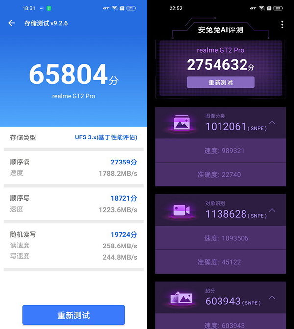 我們還使用安兔兔評(píng)測自帶的存儲(chǔ)和AI測試模塊,對(duì)真我GT2 Pro的閃存性能和AI底層優(yōu)化水平進(jìn)行了測試。很顯然,作為realme的首款高端旗艦機(jī)型,真我GT2 Pro的閃存速度自然是達(dá)到了UFS3.1該有的水準(zhǔn)。不過更令人欣喜的是,其AI跑分結(jié)果也是我們至今為止看過的最高分,換而言之,它的AI底層優(yōu)化做得更完整、相關(guān)驅(qū)動(dòng)適配得也可能更新一些。