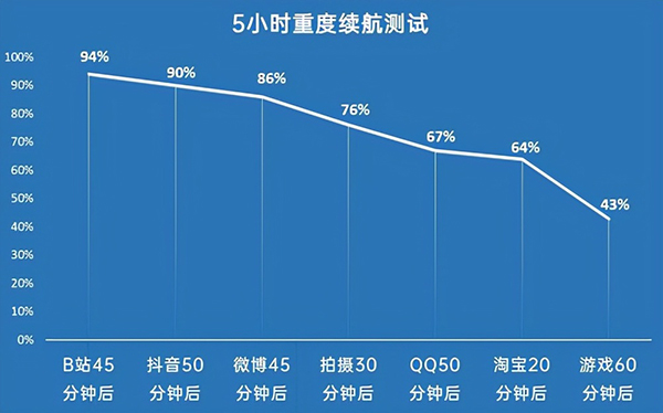 在這個(gè)電池方面,iQOO 9 Pro配備了4700mAh容量的雙電芯鋰電池,為了更直觀感受iQOO 9 Pro的續(xù)航表現(xiàn),筆者對(duì)其進(jìn)行了5小時(shí)重度續(xù)航測(cè)試,在當(dāng)前室溫環(huán)境下,連接辦公室Wi-Fi,關(guān)閉藍(lán)牙定位,屏幕亮度、音量均設(shè)為50%,其結(jié)果如下: