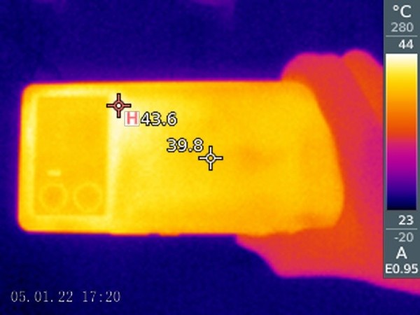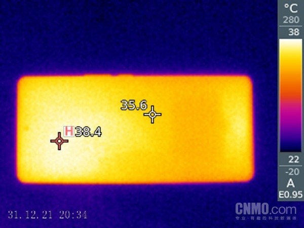 值得一提的是,iQOO 9 Pro在屏幕下部還疊加了一層0.052mm的散熱膜,它可以改善手機(jī)在亮屏場景下的發(fā)熱情況。實測運行一盤高幀率《王者榮耀》后機(jī)身正面最高溫度為38.4℃,同時通過溫槍測試圖能夠看到,iQOO 9 Pro的溫度較為平均,并沒有出現(xiàn)溫度集中的現(xiàn)象,這也能有效提升玩家的游戲體驗。