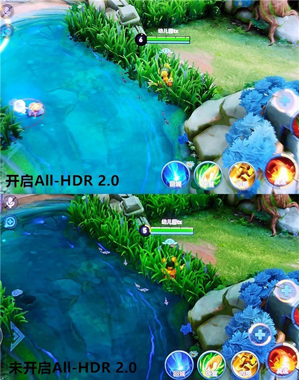 通過,游戲場景對比,我們不難發(fā)現(xiàn),當(dāng)開啟游戲All-HDR 2.0功能后,不論是場景亮度,畫面鮮艷程度以及暗部細節(jié)都比游戲原生畫面效果層次豐富;尤其是畫面暗部細節(jié)上有了明顯的提升,整體場景該亮的地方亮該暗的地方暗,保證視覺觀感上的統(tǒng)一性。