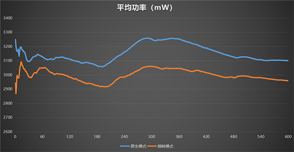 如圖所示,同樣的測(cè)試《原神》,在開(kāi)啟插幀后,整機(jī)的平均功率明顯更低。45幀模式下的渲染壓力明顯要小于原生模式下的60幀。