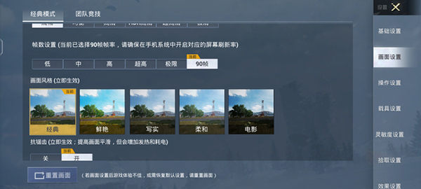 然后是吃雞手游《和平精英》,F(xiàn)PS游戲優(yōu)先照顧幀率,所以選擇「流暢畫質(zhì)+90幀+抗鋸齒開」設(shè)置。