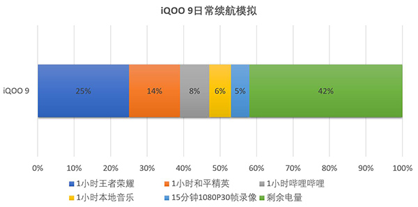 性能全開”的iQOO 9續(xù)航表現(xiàn)如何?在各一小時(shí)的《王者榮耀》120幀、《和平精英》HDR高清60幀、嗶哩嗶哩在線視頻、本地音樂(lè)播放和半小時(shí)1080P30幀錄像使用后,其搭載的4700mAh雙電芯電池還剩42%電量,無(wú)需在長(zhǎng)時(shí)間游戲后產(chǎn)生續(xù)航焦慮。