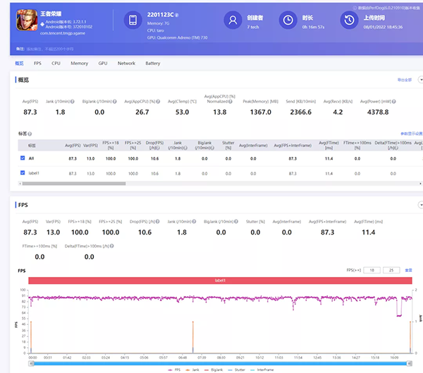 然后是王者90Hz,平均幀率是87FPS,出現(xiàn)了一次掉幀。單論幀率走勢(shì)來(lái)說,表現(xiàn)的還不如驍龍778G手機(jī)。