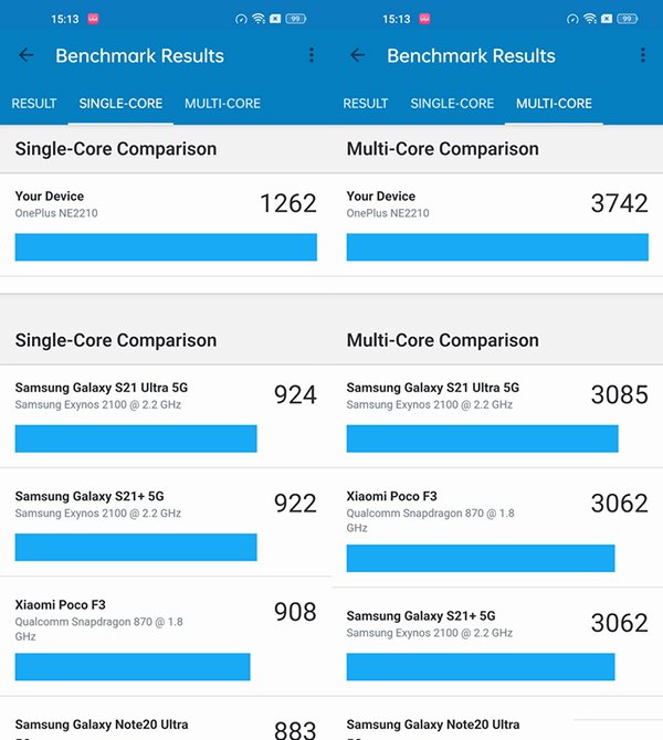 那么,一加10 Pro相比2021年的老款旗艦性能提升幅度,到底有多大呢?我們先從GeekBench所反映的CPU性能說起??梢钥吹皆贕eekBench 5.4.3中,一加10 Pro的單核與多核成績分別超過了1200分與3700分,相比于搭載驍龍888的機(jī)型,單核性能提升幅度約15%上下,多核性能則有約6%的上漲,幅度并不算特別大。
