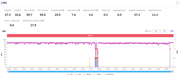 測試過程中,《王者榮耀》15分鐘出現(xiàn)了掉幀的情況,這是由于切換對局造成的正常掉幀,而其他時間幀率基本保持在90幀上下,30分鐘平均幀率為87.4;而《和平精英》的幀率曲線則同樣如此,在24分鐘時切換對局造成掉幀,其余時間基本呈一條直線,30分鐘下來,一加10 Pro運(yùn)行《和平精英》的平均幀率為88.3幀。一加10 Pro不僅在游戲里可以跑滿90幀,而且還能智能判斷切換對局的時機(jī),及時降幀節(jié)省能耗,這跟屏幕表現(xiàn)有關(guān),我們下面再詳細(xì)聊聊。