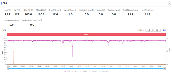 其次,通過(guò)專業(yè)測(cè)試平臺(tái)來(lái)看,vivo S12在不同的手游幀率表現(xiàn)上,該機(jī)也能輕松運(yùn)行多種大型游戲。從下列圖中可見(jiàn),vivo S12運(yùn)行90幀的《王者榮耀》,其游戲幀率高達(dá)89.3幀,幾乎接近滿幀了,全程幀率波動(dòng)也很小,沒(méi)有任何卡頓情況。