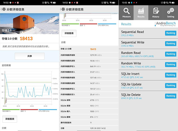 也就是說(shuō),vivo X12 Pro支持雙效內(nèi)存融合技術(shù),以及UFS3.1技術(shù),運(yùn)行內(nèi)存為12+4Gb,通過(guò)PCMark的存儲(chǔ)跑分,總分為18413,順序讀取1279.99MB/s,順序?qū)懭胧?68.19MB/S,而在AndroBench中順序讀取1911.0MB/s,順序?qū)懭胧?542.6MB/S,平時(shí)我們用vivo S12 Pro 拍個(gè) 60fps的4K視頻,它的存儲(chǔ)速度也是非常快,停止重新啟動(dòng)拍照都沒有停頓,這對(duì)于喜歡拍攝視頻的用戶來(lái)說(shuō),非常有效,避免由于存儲(chǔ)視頻而帶來(lái)的卡頓錯(cuò)失精彩。