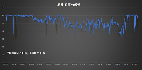 在《原神》這樣的高負(fù)載下,iQOO Neo5 SE依然擁有不錯(cuò)的表現(xiàn),全程平均幀率53.1FPS,最低幀31FPS,在高壓下雖然有著明顯波動(dòng),但整體基本盤(pán)保持穩(wěn)定,同時(shí)幀率也能維持在流暢標(biāo)準(zhǔn)之上。