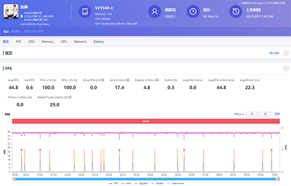 另外,根據(jù)我的測(cè)試,iQOO Neo5S在開(kāi)啟“幀率提升模式”后運(yùn)行《原神》,其平均幀率為44.8 幀。這里需要注意的是,測(cè)試軟件Perfdog 在iQOO Neo5S開(kāi)啟“幀率提升模式”后只能測(cè)出一半的幀數(shù),實(shí)際平均幀率為顯示數(shù)據(jù)的2倍。