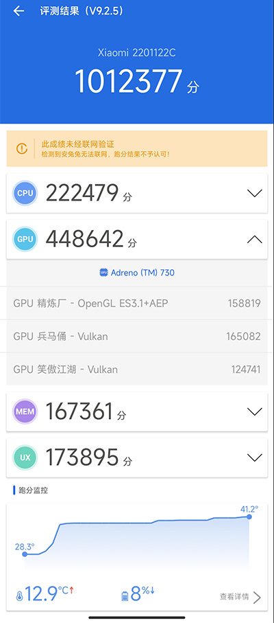 常溫下安兔兔總分,輕松破百萬(wàn)大關(guān),其中GPU分項(xiàng)得分約44.8W,對(duì)比驍龍888 Plus安兔兔GPU 32W左右的典型高分,足見(jiàn)這次GPU的巨大提升,這對(duì)游戲黨們而言,一定是個(gè)好消息。
