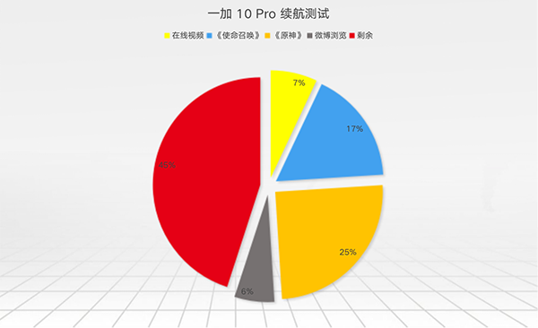 連接WiFi并使用大概40%左右亮度下,在線觀看1080P 60幀電影一小時(shí)耗電為7%,一小時(shí)《使命召喚》耗電為17%,一小時(shí)《原神》耗電為25%,還有一小時(shí)的微博瀏覽耗電為6%。