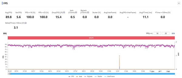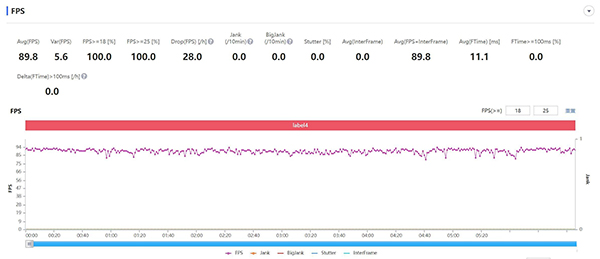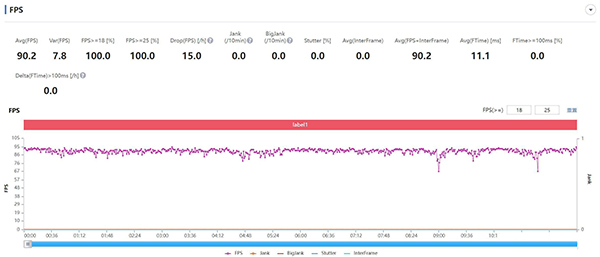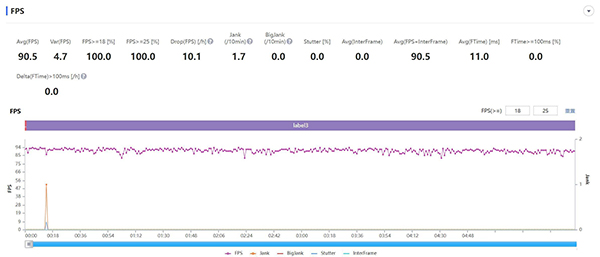 《和平精英》里面我們截取了連續(xù)2場(chǎng)游戲?qū)?,總?jì)約1小時(shí)的幀率,一加10 Pro只有在第一局后期在密林中頻繁扔煙霧彈激戰(zhàn)的情況下,游戲幀率才會(huì)稍微降低至82fps左右。在房區(qū)或是平原地帶跑圖的時(shí)候,游戲則是雷打不動(dòng)的90fps穩(wěn)定運(yùn)行。