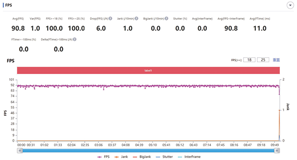 支持《英雄聯(lián)盟手游》高幀率模式,在高畫質(zhì)下可以開啟90Hz刷新率,游戲平均幀率達到90.8fps。