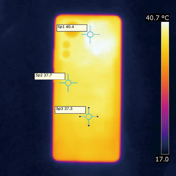 在半小時《原神》游戲結束后,我使用紅外測溫儀測量小米12 Pro的機身溫度。此時小米12 Pro機身最高溫度為40.4℃,位于后置影像模塊的右側(cè),其余區(qū)域的機身溫度多數(shù)可以不超過38℃。游戲過程中,手指接觸的機身邊框就是小米12 Pro的主要發(fā)熱區(qū)域。可見在小米12 Pro的2900平方毫米超大VC液冷系統(tǒng)壓制下,驍龍8移動平臺在非極致模式下,整體的功耗得到了不錯的控制。