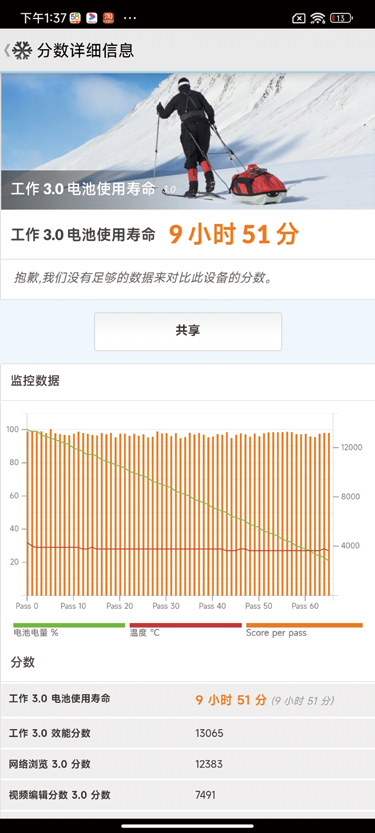 在PCMark的工作3.0場(chǎng)景測(cè)試中,小米12 Pro堅(jiān)持了9小時(shí)51分鐘后,還有13%電量剩余。