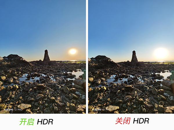 我們同樣用超廣角鏡頭對比 HDR 的成像效果,能明顯看到看齊 HDR 后無論是左側的礁石陰影,還是遠去夕陽照射的海面,細節(jié)都要遠勝于無 HDR。