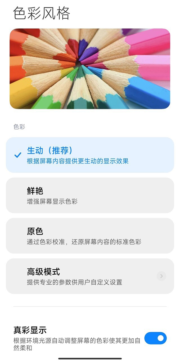 在屏幕設置選項中,小米12 Pro的用戶選擇自由度非常高。小米12 Pro和前代機型一樣提供了生動、鮮艷、原色三種色彩模式,大家可以根據(jù)自己的喜好來選擇相應的色彩模式,同時小米也提供了可以根據(jù)光照環(huán)境調整屏幕色彩顯示的真彩顯示模式。