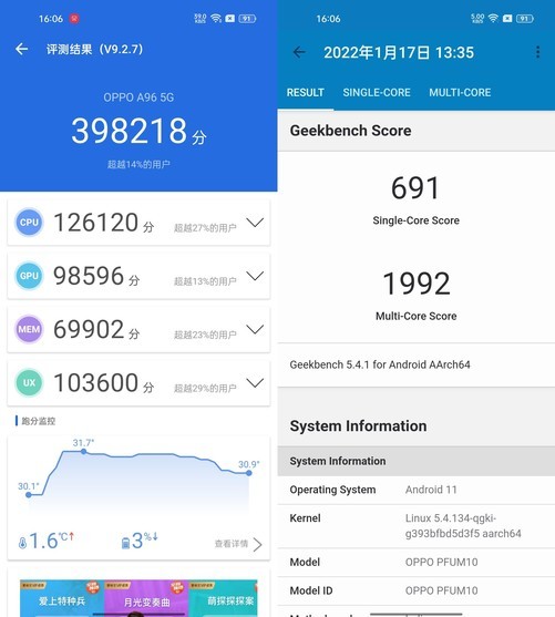 通過兩款跑分測試軟件,我們可以看到搭載驍龍695的OPPO A96安兔兔跑分成績?yōu)?98218分;Geekbench5單核成績691分,多核成績1992分,符合我們的預(yù)期。