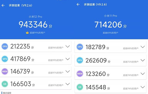 可以看到,小米12 Pro安兔兔跑分達到了943346分,小米11 Pro安兔兔跑分為714206萬。具體到各個單項,CPU部分二者差了將近3萬分,GPU部分差距則更為明顯,小米12 Pro要比小米11 Pro多出15萬分左右。