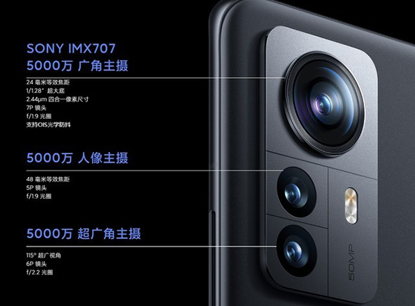 二者均采用了后置三攝方案,小米12 Pro采用了廣角主攝+人像主攝+超廣角主攝的基礎(chǔ)配置,均為5000萬像素,其中廣角主攝采用了索尼IMX707廣角鏡頭,這款傳感器也是目前索尼最頂級(jí)的傳感器之一,擁有1.28英寸超大底。人像鏡頭則支持2倍光變和20倍數(shù)碼變焦。