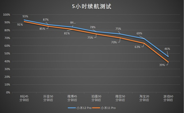經(jīng)過45分鐘B站視頻播放、50分鐘抖音短視頻播放、45分鐘微博、30分鐘1080P相機錄制、50分鐘微信聊天、20分鐘淘寶、60分鐘《王者榮耀》共計5小時耗電后,小米12 Pro的電量最終剩余46%;小米11 Pro的電量最終剩余39%。