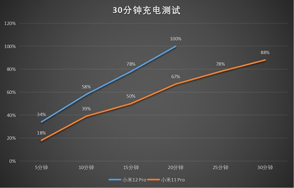 充電方面,這部分基本沒什么懸念,小米12 Pro搭載的120W快充可以在20分鐘左右充滿整部手機,每分鐘可以充入230mAh的電量。小米11 Pro在30分鐘充電測試中,前20分鐘只沖入了67%,30分鐘一共充入88%,實際每分鐘可以充入147mAh,就充電效率而言,小米12 Pro確實要快得多。