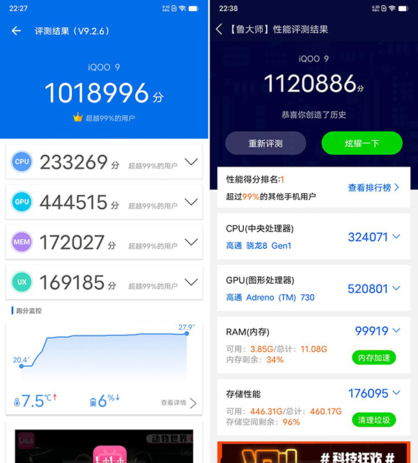 首先,通過大家所熟知的安兔兔和魯大師兩款主流綜合跑分軟件得分就能一目了然,iQOO 9破百萬的跑分成績以及超越99%其他手機(jī)用戶的排名就是最好的實力論證。