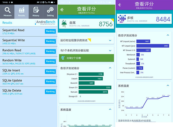 而針對存儲內(nèi)存在AndroBench的測試中,其順序?qū)懭胨俣瓤蛇_(dá)1430.33MB/s,順序讀取速度可達(dá)1712.9MB/s,這一成績對于大型文件的讀取以及游戲加載,絕對能夠節(jié)省不少的時間。此外,筆者還通過Vellamo軟件測試了iQOO 9的單核和多核跑分成績,最終的得分成績同樣堪稱絕對優(yōu)秀,由此可見新驍龍8的性能確實非常的強勁。