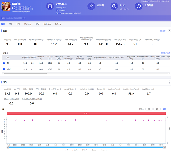 PerfDog監(jiān)測到的平均幀率為44.8幀,波動幅度為0.6幀。按照上面的“乘以2”原則來看,實際平均幀率應該是89.6幀。而出現(xiàn)44.8幀和89.6幀的原因,是“優(yōu)化功耗”先將GPU需要輸出的幀數(shù)從60幀下調(diào)至45幀,在此基礎上插入一倍的幀率,也就實現(xiàn)了90幀的高幀體驗,PerfDog監(jiān)測的44.8幀平均幀率正是GPU渲染幀數(shù)下調(diào)之后的結(jié)果,89.6幀則是插幀之后的正常幀率表現(xiàn)。