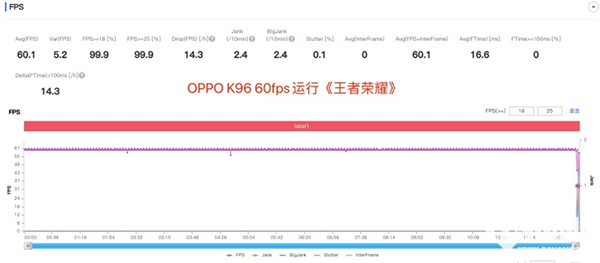 想必大家也十分好奇 OPPO A96實(shí)際的游戲表現(xiàn)。對(duì)此,我們讓 OPPO A96運(yùn)行熱門網(wǎng)游《王者榮耀》,開(kāi)啟高占率。結(jié)果如上圖, OPPO A96的幀率始終穩(wěn)定在60fps左右,即使遇到復(fù)雜團(tuán)戰(zhàn),也沒(méi)有大的幀率波動(dòng)。