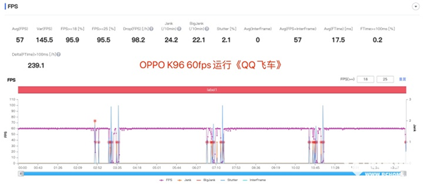 此外,我們還讓 OPPO A96運(yùn)行《QQ飛車》,同樣開(kāi)啟高幀率,結(jié)果如上圖所述,OPPO A96的幀率依然可以保持穩(wěn)定。如果剔除結(jié)算界面幀率的抖動(dòng),我們甚至可以說(shuō),OPPO A96可以滿幀運(yùn)行《QQ飛車》。