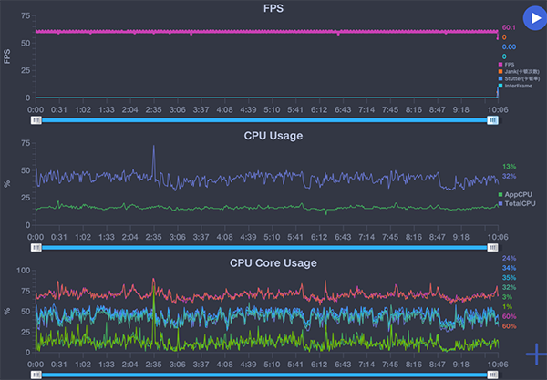 介紹完OPPO A96軟硬件的配置信息,下面我們直接來看一看它的游戲?qū)崪y表現(xiàn)吧。在《王者榮耀》的游戲測試中,我們手動將將幀數(shù)設(shè)置為60幀,并且開啟了游戲內(nèi)的一系列特效,將特效全部拉滿后進(jìn)入對戰(zhàn)進(jìn)行實測。從下面的測試結(jié)果來看,OPPO A96的幀率曲線是比較穩(wěn)定的,平均幀數(shù)達(dá)到了60滿幀的水平,波動僅為0.3FPS,也幾乎沒有卡頓、掉幀等現(xiàn)象,在增強(qiáng)型液冷散熱系統(tǒng)的加持下,機(jī)身也沒有明顯的發(fā)熱問題,游戲體驗不錯。